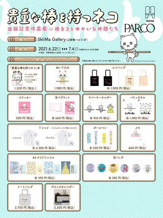 株式会社パルコ(本社:東京都渋谷区 以下、パルコ)で運営するコミュニティ型ワーキングスペース『SkiiMa(スキーマ)』心斎橋店にて渋谷パルコGallery Xで開催(2021年4月23日~5月24日まで)された「貴重な棒を持つネコ」出版記念作品展『棒ネコとゆかいな仲間たち』の巡回展の大阪開催が決定いたしました。