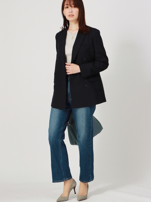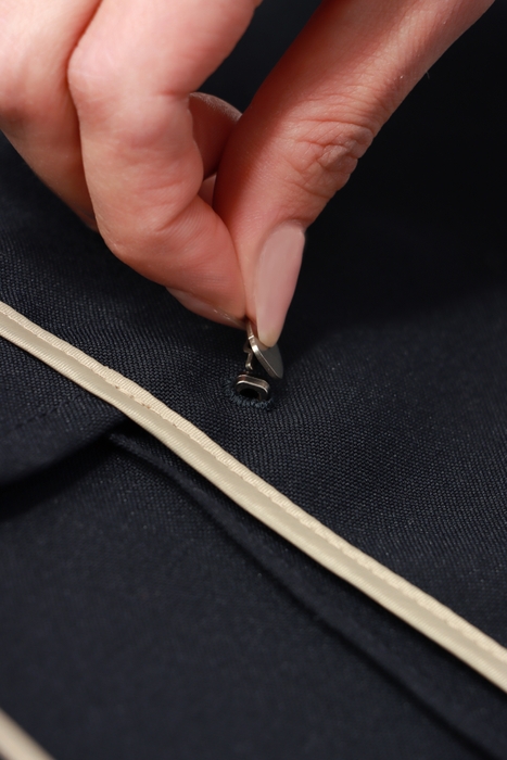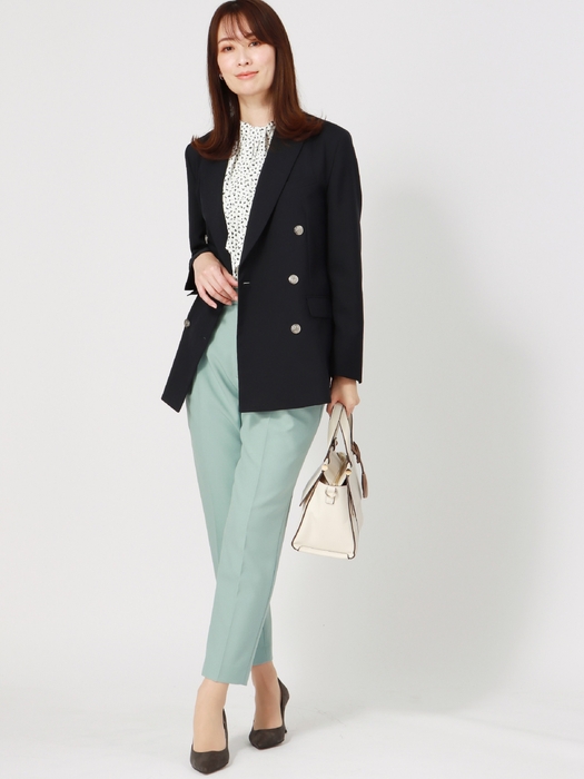 最近はトラッド(トラディショナル)がトレンドのキーワードになっていることもあり、紺ブレザーが注目されオフィスウェアとしても定着してきています。中でもよりクラシックなダブルブレストのメタルボタン仕様は“こなれ感”がある一方で、お客様からメタルボタンがビジネスシーンで目立ってしまうとの声も寄せられていました。そこで、その日の気分やコーディネート、着用シーンに合わせボタンの取り換えができるブレザーを企画。裏ボタンを外すことで、付属したブレザーと同系色のボタンへ簡単に変更でき、ビジネスシーンに適した落ち着いた雰囲気を演出します。また、デザインはややゆとりを持たせたシルエットでオーバーすぎず、きちんと感と休日スタイルにも合うカジュアルなゆるさも備えています。幅広いスタイリングに着回しできる万能アイテムです。