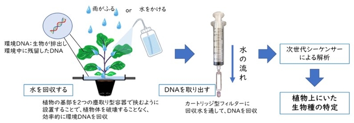 まず、人工的にかけた水や空から降ってくる雨が植物の表面を流れ、葉や茎を伝って地面に落ちてくるのを根もとに設置した容器で収集し、その水から環境DNAを抽出します。次に、抽出した環境DNAについて次世代シーケンサーを用いたメタバーコーディング※2 の手法で分析し、植物上にどのような虫がいたのかを調べます。