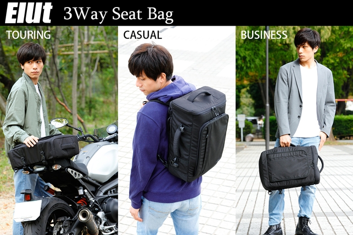 バイクに装着して【シートバッグ】として、ショルダーベルトを引き出せば【バッグパック】、そして横持ちハンドルで【ビジネスバッグ】、シーンに応じて使い分けできる、3WAYシートバッグ。