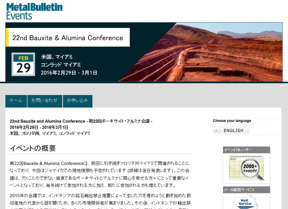国際会議 「第22回ボーキサイト・アルミナ会議」(Metal Bulletin主催)の参加お申込み受付開始