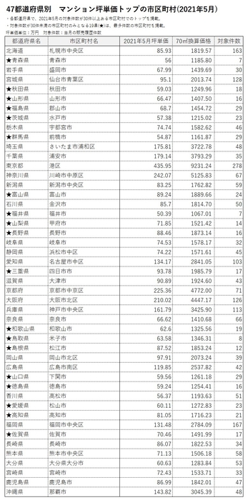 ■47都道府県 マンション坪単価トップの市区町村(2021年5月)