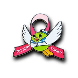 バッジのデザインは、1997年に「夢みなと博覧会」の公募マスコットキャラクターとして誕生した「トリピー」と、乳がん啓蒙活動を表す世界共通のシンボル、「ピンクリボン」を組み合わせた可愛らしい作品。鳥取名産の21世紀ナシをイメージしたトリピーがピンクリボンとマッチして、色彩的にも楽しいアイテムが完成し、医療関係者の女性をはじめ、一般のお子様から年配の方まで「可愛い!」と広くご購入いただいているそうです。