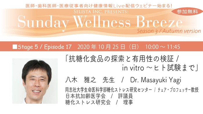 『SELISTA Inc. Presents; Sunday Wellness Breeze』は日頃、抗加齢医療・予防医療・栄養療法に携わられている先生方を対象に、爽やかな微風が心地よいゆったりとした日曜日の朝、ブランチでも食べながら新しい予防医療に関する情報を気軽な気持ちでご視聴いただける医療のプロ向け無料健康情報Live配信ウェビナーです。毎回各分野の第一人者を講師にお招きし、最新の医療情報を無料で提供致します。