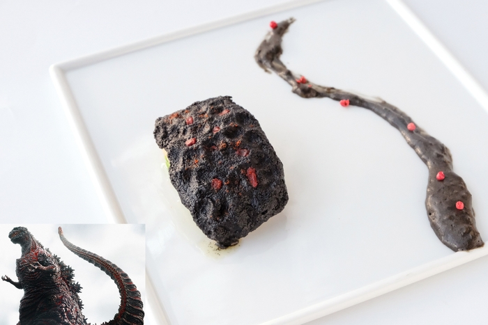淡白な味わいのヒラメに合わせるのは、バター、白ワインビネガー、エストラゴン、ハーブで作るやさしい酸味のベアルネーズソース。ソースにはイカ墨を混ぜてピンクペッパーを散らし、ブラックオリーブとトマトのクルートを乗せて『シン・ゴジラ』を再現しました。