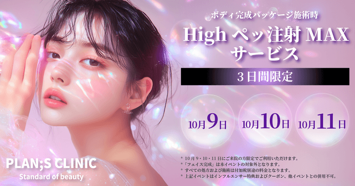 韓国美容クリニック PLAN;S CLINICでは、2025年10月9日(木)から10月11日(土)までの3日間で、ボディ完成パッケージ施術をご利用のお客様を対象に「Highペッ注射MAX 1部位サービス」を提供いたします。
