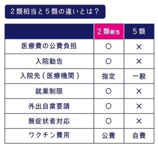 今までは2類相当という2類よりも厳しい分類でしたが、5類相当とはインフルエンザなどと同等となります。実際にどのような違いがあるのか比較してみましょう。