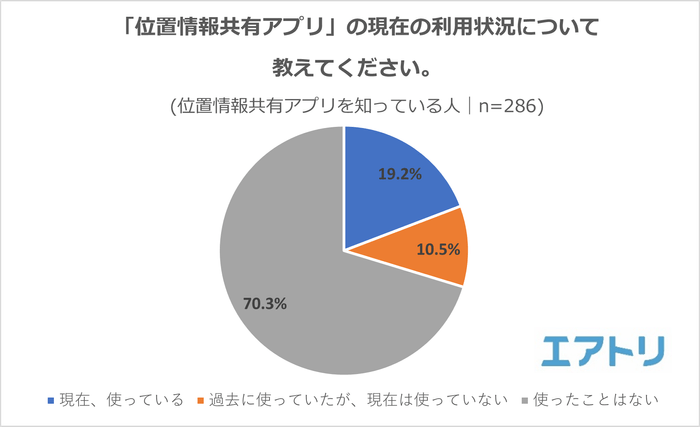 位置情報共有アプリを知っている人へ現在の利用状況を聞いたところ、「使ったことはない」人が圧倒的で70.3%でした。一方で「現在、使っている」と回答した人は19.2%、「過去に使っていたが、現在は使っていない」が10.5%でした。