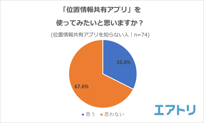位置情報共有アプリを知らない人へアプリを使ってみたいか聞いたところ、「思わない」が67.6%だった一方、アプリを使ってみたいと「思う」と回答した人は32.4%でした。