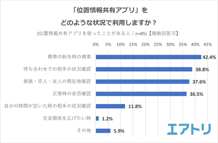 位置情報共有アプリを使ったことがある人にどのような状況で利用するか聞いたところ、「携帯の紛失時の捜索」が最多の42.4%、「待ち合わせでの相手の状況確認」が38.8%、「家族・恋人・友人の現在地確認」が37.6%となりました。