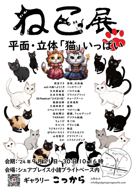 Gadget Garage Cafe(所在地:東京都三鷹市、代表:大日方 祐彦)は、国道18号線から小諸インターに向かう登り口にあるギャラリー「こっから」にて、9月21日から9月30日までの10日間、「ねこ展」を開催します。