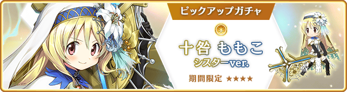 『期間限定 十咎ももこ シスターver. ピックアップガチャ』では下記ピックアップ対象の魔法少女およびメモリアの提供割合がアップしております。