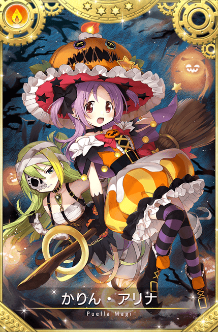 本ガチャでは、魔法少女「かりん・アリナ ハロウィンver.(CV.金元寿子・竹達彩奈)」をはじめ新メモリア「逆らう者にはキャンディを!」や「かぼちゃの王様大満足!」「いつもいつでもすれ違い」が期間限定で登場いたします。