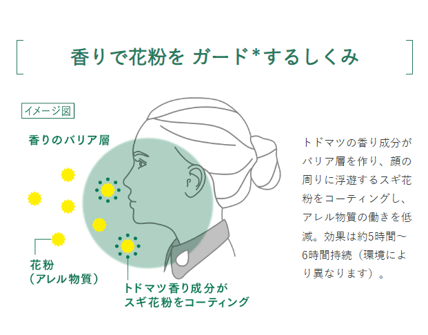 香りを感じやすい衣類の襟などにピタッと貼るだけで、トドマツの香り成分がバリア層を作り、顔の周りに浮遊するスギ花粉をコーティングし、アレル物質の働きを低減*するシールタイプの花粉対策商品です。