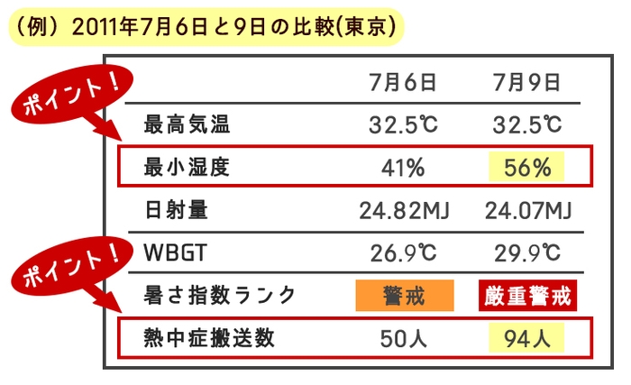 暑さ指数(WBGT)に関して、温度が同じ温度でも、湿度が高いと危険性は増していくことがわかりますね。実際同じ32.5℃の気温でも湿度が15%違うだけで警戒から厳重警戒になり熱中症で搬送される人も、2倍近くに増加します。