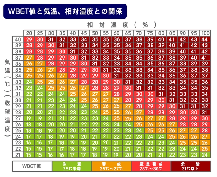 出典:厚生労働省 WBGT値と気温、相対湿度との関係 https://www.mhlw.go.jp/stf/houdou/2r9852000001dwae-att/2r9852000001dwhn.pdf