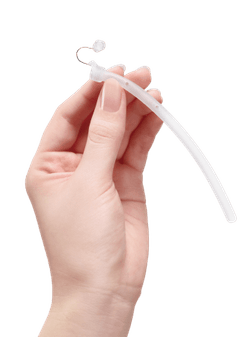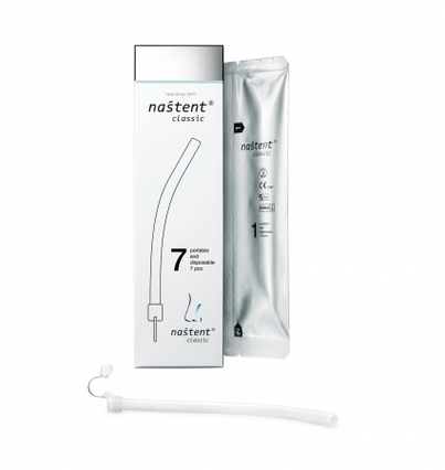 ナステントは、シリコーンでできた非常に柔らかいチューブ状の使い捨て鼻腔挿入デバイスです。救急医療現場での気道確保の手法を応用し、睡眠時に狭くなる気道を確保します。使用方法は簡単で、睡眠前に使用者自身でナステントを鼻腔に直接挿入するだけです。使い捨てのため、毎回清潔なものを使用できる簡便なデバイスです。