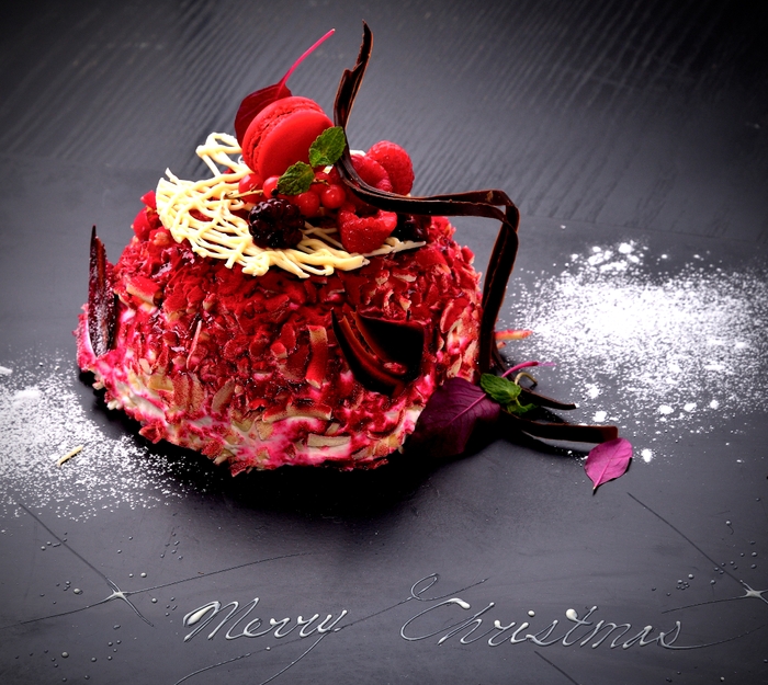 シンガポール産エクストラダークチョコレートを使用したふんわりとしたテクスチャーの真紅のクリスマスケーキです。ほんのりビターな風味のチョコレートクリームとベリーの酸味が調和したリッチなくちどけに、華やかなフレーバーが包み込みます。