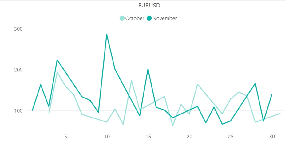 11月のユーロドル(EUR/USD)のボラティリティは、10月と比べ最大ボラティリティの増加が目立ちました。11月の最大ボラティリティを記録したのは10日の286.3pipsで、10月の193.6pipsと比べ100pips近く増加しています。同日は米国CPIの発表が行われ、予想に反して数値が鈍化したことがボラティリティに表れた結果です。一方で、大きなボラティリティの上昇がありながらも、1日当たりの平均ボラティリティは先月比で約10pipsほどのわずかな増加にとどまっています。