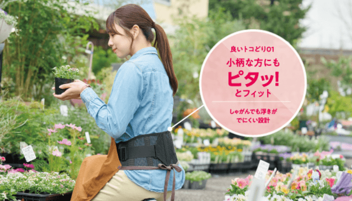 動きを邪魔しにくく、小柄な方にも食い込みにくい設計です。前かがみになった時、腰に隙間ができにくい幅とサポート力、動きやすさのバランスにこだわり、設計しました。