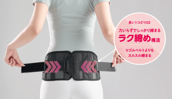 滑車の原理を応用した当社オリジナルの逆締め構造により、補助ベルトを軽く引っ張ることでググッと集中的に背部を締め込みます。気になる腰へピンポイントにアプローチするので、サポートしつつ動きを妨げにくい所がポイントです。