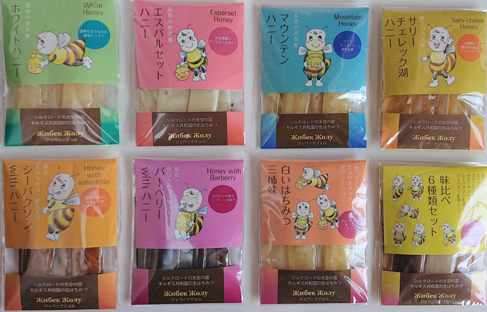 新発売を記念して38(ミツバチ)名様に、写真の右下の味比べ6種類セット(5g・6本入り)をプレゼントします。オンラインショップ・ジェベックジョルのCONTCTフォームページに「キルギスの蜂蜜・味比べ6種類セット希望」と記入してご応募ください。ご応募多数の場合は抽選となります。応募締め切りは、7月31日24時です。詳細は、オンラインショップでご確認ください。