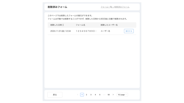 削除されたフォームは「削除済みフォーム一覧」に移動され、90日以内であれば簡単に復元可能です。