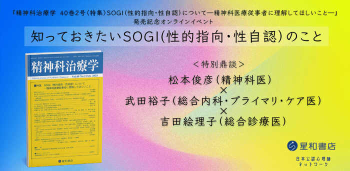 「SOGI(性的指向・性自認)」を特集テーマにした精神科治療学 40巻2号の発売記念オンラインイベントを企画しました。企画編集いただいた松本俊彦先生、編集協力・執筆いただいた武田裕子先生、吉田絵理子先生のお三方に、SOGIの基礎知識、当事者の現状、精神科領域を含む医療現場でのSOGIへの配慮、などをテーマに鼎談形式でお話いただきます。対談終了後は、先生方に参加者の方からのご質問にお答えいただきます。