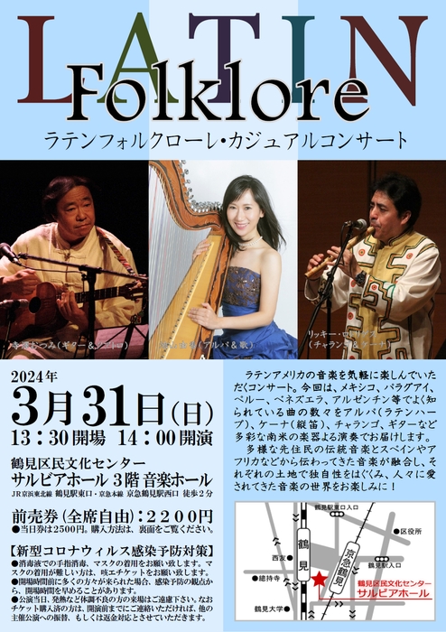 ヒラルディージョ事務局(神奈川県横浜市)主催、『ラテンフォルクローレ・カジュアルコンサート』が2024年3月31日 (日)に横浜市鶴見区民文化センター サルビアホール 3F 音楽ホール(神奈川県横浜市鶴見区鶴見中央1-31-2 シークレイン内)にて開催されます。