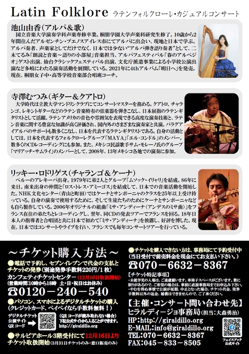 南米特有の弦楽器を弾きこなす日本屈指のラテンギタリスト寺澤むつみ、ケーナ(南米の縦笛)をはじめ、様々な南米の楽器を演奏するペルー人リッキー・ロドリゲス、日本では数少ないアルパ弾き語り奏者池山由香、このラテンフォルクローレのトップミュージシャンたちによるステージをお楽しみに!