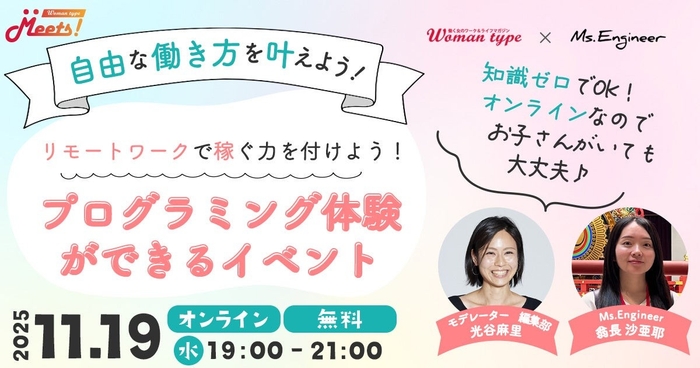 株式会社キャリアデザインセンターが運営するWebマガジン『Woman type』(https://woman-type.jp/wt/feature/)は、エンジニアになりたい女性を応援する無料イベントを2025年11月19日(水)に開催致します。