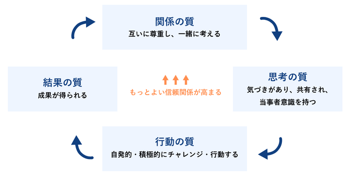 これは、一人ひとりの関係の質を高める機会となり、各自のコミュニケーションが向上することで良い情報が得られ「思考の質」が向上し、それにより「行動の質」が改善され、結果として「結果の質」が向上するという、いわゆる「組織の成功循環モデル」を回すキッカケとなります。