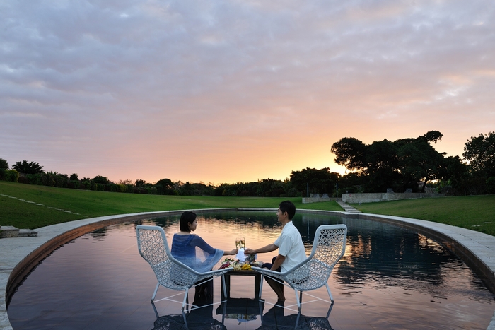高い建物がなく、視界を邪魔するものがない竹富島では、気温や湿度、雲の位置によって、刻一刻と色が変化する美しい空模様を眺めることができます。夏は、朝焼けが綺麗に見える好条件が揃う季節。プールに用意された特等席で、朝焼けを眺めながらフルーツを中心とした彩り豊かな朝食とシャンパーニュを楽しめます。 *夏の明け方のこと