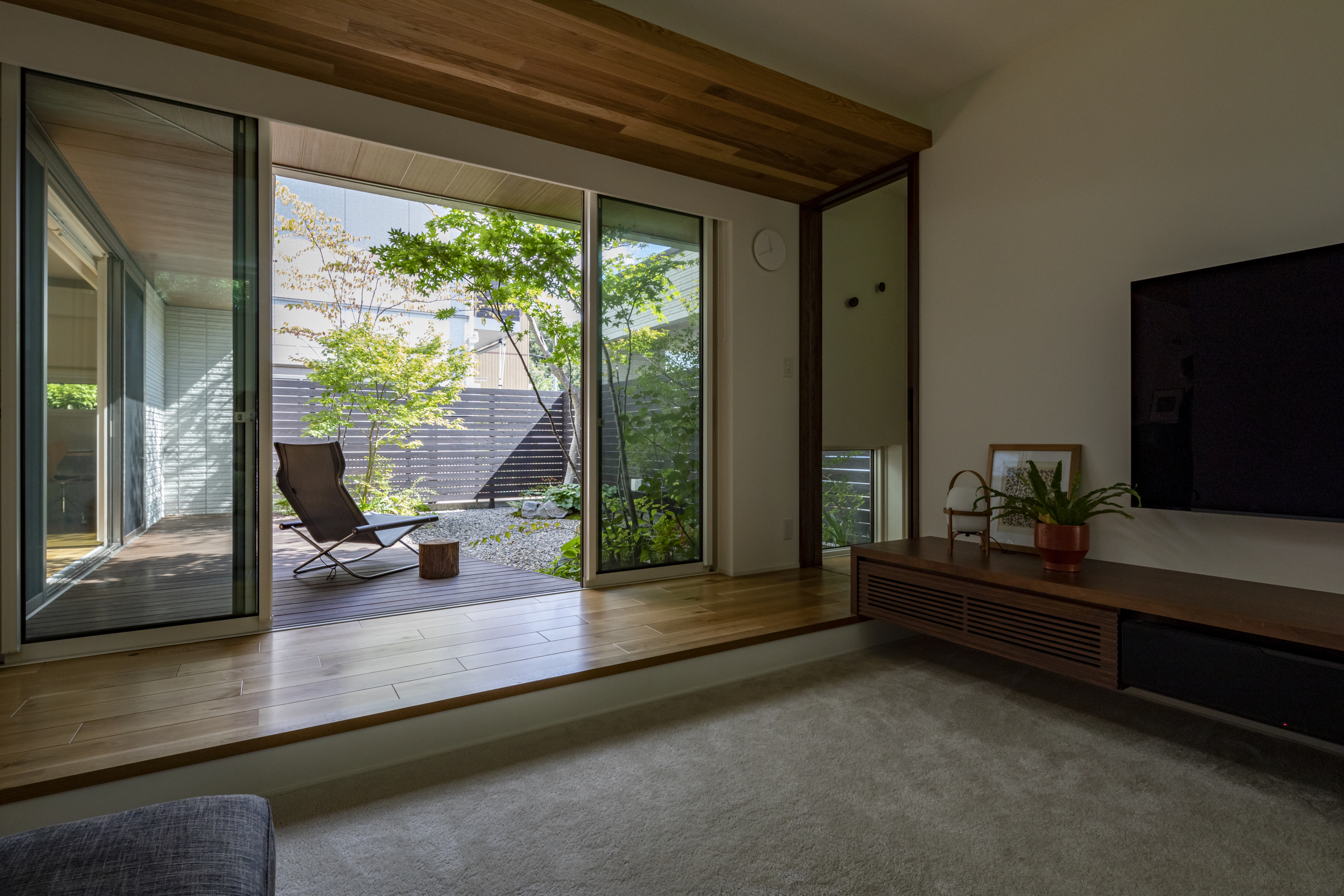 リビングに通されて最初に目に飛び込んでくるのが大開口から見える中庭です。日中は光や風にそよぐ草木、空の景色が取り込まれ、自然との一体感が感じられます。