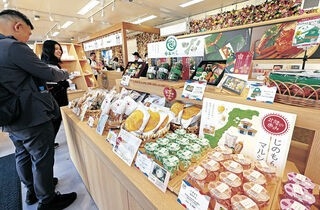 店頭には、七尾市出身の世界的なパティシエである辻口博啓さんが創作した菓子「YUKIZURI」に、射水市生まれの食べられるバラを加えた新商品をはじめ、加賀野菜の加工品や笹寿し、蟹棒寿し、富山県産の「ばらいも」を使った万博限定の人形焼き「ミャクミャク焼き」などが多彩に並んでいます。