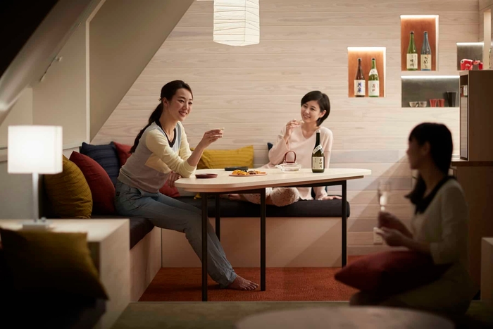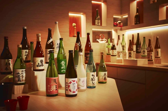客室は、メゾネットタイプのスイートルーム。1階の広々としたリビングには、会津の30蔵の日本酒の瓶が並びます。ラベルで特長を知った上で、日本酒を飲むと会話も弾みます。