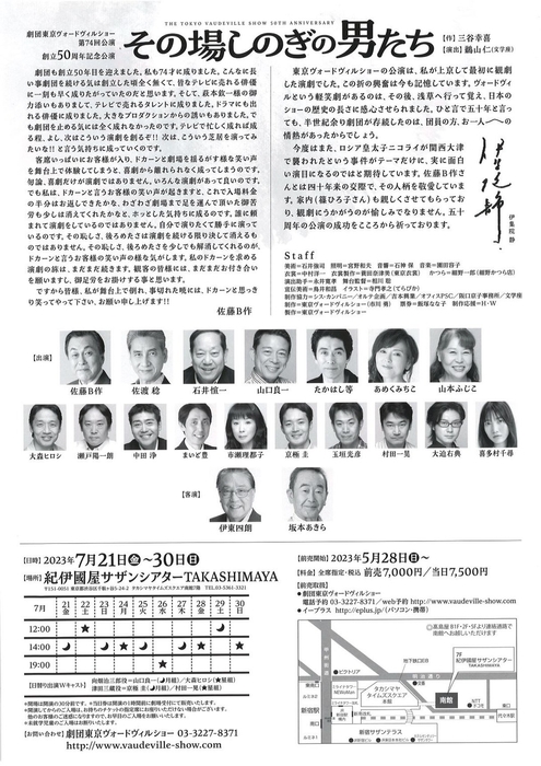 三谷幸喜脚本で 2013 年には第 48 回紀伊國屋演劇賞団体賞を受賞した超人気作『その場しのぎの男たち』を 2023年7 月、紀伊國屋サザンシアターTAKASHIMAYA にて 10 年ぶりの上演!ゲストには伊東四朗、そして劇団創立時のメンバーでもある坂本あきらを迎えます。本作としては初となる文学座の鵜山仁の演出で挑戦!