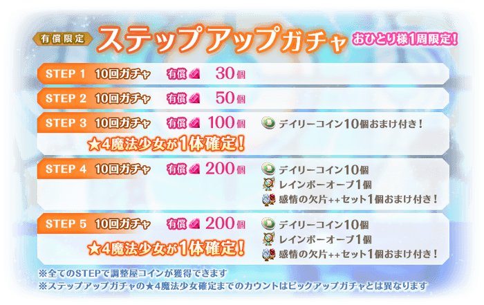 ※STEP3、STEP5での★4魔法少女について、ピックアップ対象の魔法少女が確定するわけではございません。