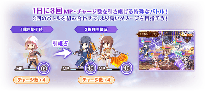 挑戦回数を消費するバトルにて獲得したCharge Combo数やMPを引き継いで挑戦できます。