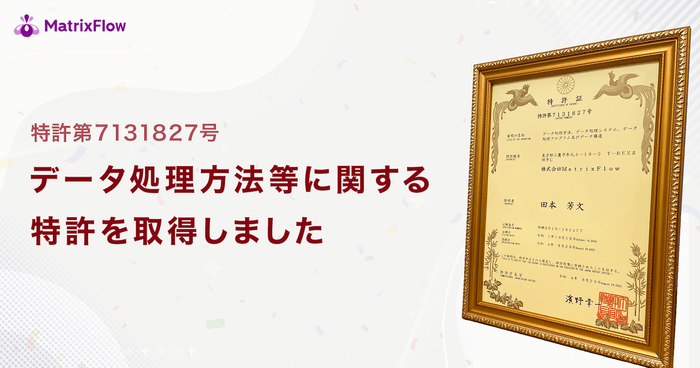 ビジネスのためのAI活用プラットフォーム「MatrixFlow」を提供する、株式会社MatrixFlow(本社:東京都台東区、代表取締役:田本 芳文)は、「データ処理方法、データ処理システム、データ処理プログラム及びデータ構造」に関して特許を取得したことを発表いたします。