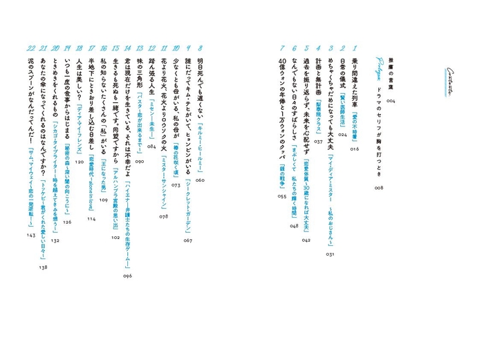 ある日、ふと目にしたドラマのごく平凡なセリフが、小さなナイフのように飛んできて胸に刺さることがある。そのひと言に大の大人が声をあげてわんわん泣くこともあれば、わけもなく楽しくなってにこにこしている自分を発見したりもする。そんなときぼくたちは、自分でも気づかないうちに人生の栄養ドリンクを飲んでいるのだ。