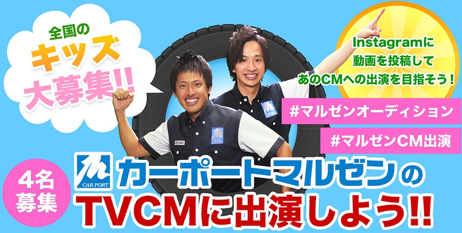 タイヤ・アルミホイールなど、カー用品を中心に小売販売を行う株式会社カーポートマルゼン(本社:大阪市北区、代表取締役社長:米岡 秀高)は、法人設立30周年を記念し、2019年1月4日(金)から1月31日(木)まで、Instagramの投稿で同社のTVCMの出演権が当たる「全国のキッズ大募集!マルゼンTVCM出演キャンペーン」を実施中です。