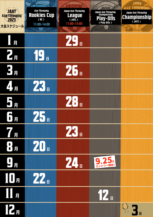 斧投げ日本一決定戦。「Japan Axe Throwing Championship 2023 @TOKYO」とは、2023年度の斧投げ日本一を決定するスポーツ大会のことです。この大会では、2023年1月1日から11月12日の期間で実施される予選大会で、12月3日に東京で開催される最終大会(本戦)に出場する15名を選出します。選出方法は、まず、1月1日から10月22日の期間での累積サーキットポイント(*1)上位12名が選出されます。(*2)それに加えて、11月12日に東京、名古屋、大阪で開催される <Japan Axe Throwing Championship Play-Offs 〜ダークホースになれ。〜> の各開催地上位1名の合計3名が選出され、最終大会(本戦)出場者16名が決定されます。