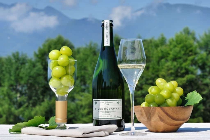 BOOKS&CAFEに隣接する八ヶ岳ワインハウスでは、シャインマスカットに合うワインをセレクトします。シャインマスカットの「酸味」「風味」「甘味」に合わせたワインです。例えば、柔らかな泡の刺激があり、キリっとした酸味が心地よい、繊細なスパークリングワイン「エチュード ルバイヤート(丸藤葡萄酒工業株式会社/山梨県勝沼市)」を用意します。ゲストが気分に合わせて量や種類を選べるよう、テイスティンググラス、ミニボトル、ボトルで販売します。秋めいた南アルプスの山々を眺められるテラスで、シャインマスカットのメニューとともに楽しむのがおすすめです。