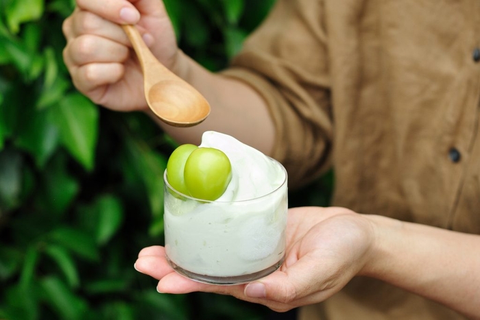 なめらかで、とろけるようなくちどけのジェラートで、シャインマスカットの豊かな香りが引き立つ、優しい味わいが特徴です。