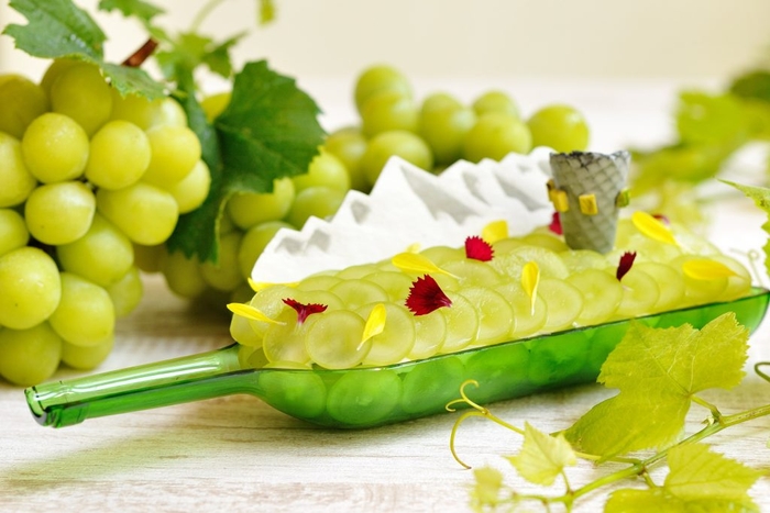 味覚の秋に食べたくなるフルーツと言えば、ぶどう。山梨県のぶどう栽培は、1,300年前から始まり、現在では日本一の栽培面積と生産量を誇ります(*)。そんな山梨県に位置するリゾナーレ八ヶ岳では、贈り物として人気のシャインマスカットに注目しました。シャインマスカットは、「ブドウ安芸津(あきつ)21号」と「白(はく)南(なん)」をかけ合わせ、2006年に品種登録された日本生まれの白ぶどうです。大振りで果汁たっぷり、種もなく果実を皮ごと食べられるシャインマスカットを贅沢に楽しんでいただきたいとの思いから、企画しました。