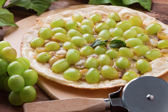 一面にシャインマスカットを敷き詰めた「ごろごろシャインマスカットピザ」