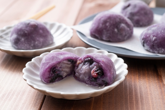 天然の紫色が鮮やかなかわいい大福です。ブルーベリーの風味はあんこととても相性がいいので、生地にもあんにも入れて、ブルーベリーの酸味・甘味・香りがたっぷりの和菓子に仕上げました。生地にレモン汁をいれることで発色がよくなります。この大福生地は冷蔵庫に入れてもかたくなりにくく、次の日でもおいしく召し上がれます。