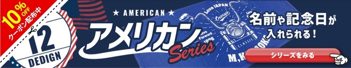 アメリカンシリーズは、カスタマイズ可能なデザインが特徴のラインナップです。デザインは12種類!バイクやエンジン、ピストンなど、アメリカンカルチャーにインスパイアされた力強いモチーフが揃っています。これらのデザインにお名前や日付を入れることができ、オリジナルのTシャツ、パーカー、タオルなどを作成できます。アメリカンスタイルのクールなアイテムで、個性を表現できるだけでなく、特別なギフトとしても喜ばれること間違いなしです。