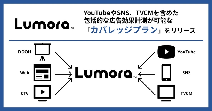 「Lumora™」は、これまでDOOH(デジタル屋外広告)とWeb、コネクテッドTV(以下CTV)への一括広告配信と統合分析を提供してきました。この度リリースした「カバレッジプラン」では、YouTubeとSNS(X、Facebook、Instagram、TikTok、LINE)、TVCMも含めた広告効果の統合的な計測を実施いたします。